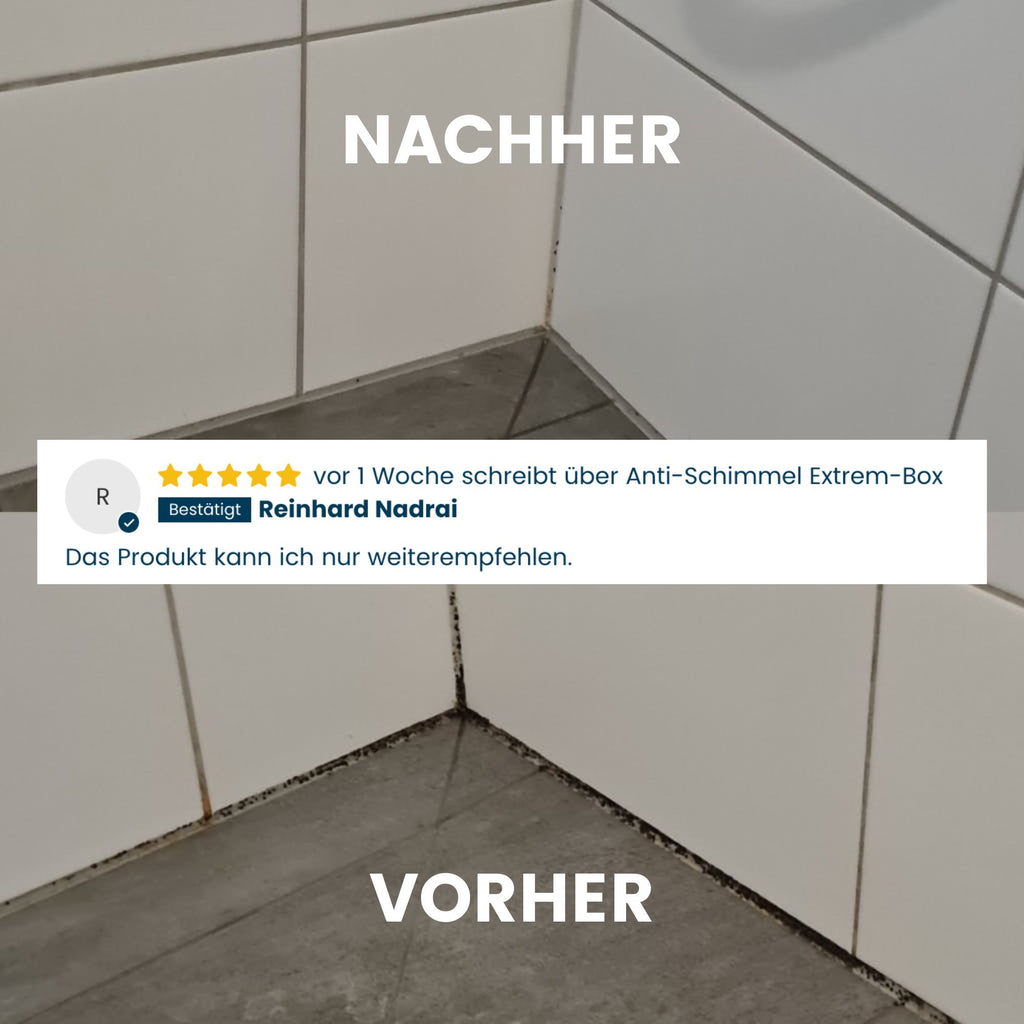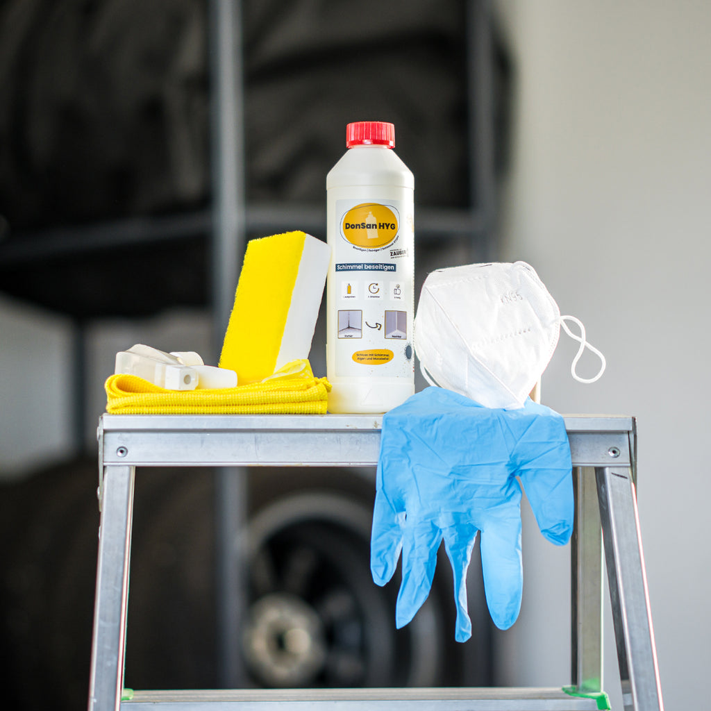 Bitte beachtet: Bei der Schimmelentfernung ist neben einer guten Belüftung auch das Tragen von Handschuhen und Mundschutz für eure Gesundheit wichtig. Also am besten als Erstes das Fenster auf und im Anschluss Mundschutz und Handschuhe anziehen. Tipp: In unserer Zauberfein „Anti-Schimmel Extrem-Box“ findest du nicht nur unser wirksames Mittel gegen Schimmel, sondern auch Mundschutz, eine Rundbürste zum Abbürsten des Schimmels und ein Mikrofasertuch zum nach- bzw. abwischen und reinigen der befallenen Stellen.