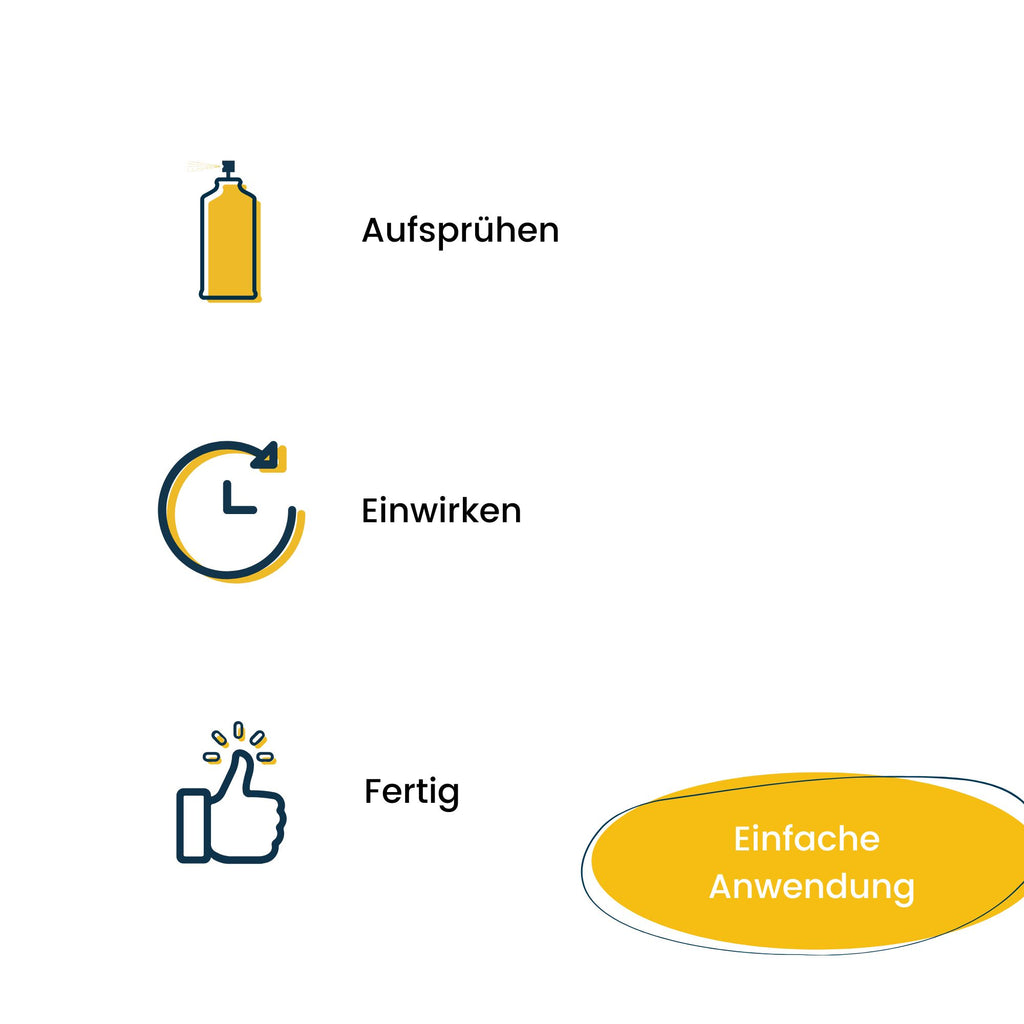 Dann kann es direkt losgehen: Sprüht das Zauberfein Anti-Schimmel-Spray aus einer Entfernung von ca. 15 Zentimeter auf die befallenen Silikonfugen und lasst das Mittel eine Stunde einwirken. In der Regel sollte nach der Einwirkzeit die Fuge bereits sichtbar vom Schimmel befreit sein. Sofern dies bei euch noch nicht der Fall sein sollte, könnt ihr die Rückstände auf der Fuge mit der Rundbürste vorsichtig abbürsten. Sollte auch dann noch Schimmel auf der Fuge vorhanden sein, empfehlen wir euch, die Prozedur noch einmal zu wiederholen. Zum Abschluss nur noch die behandelten Flächen mit Wasser abspülen. Die Fenster solltet ihr zum Lüften noch ein wenig offenlassen, damit die Luft im Raum ausgetauscht wird und der Geruch schneller verfliegen kann.